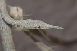 Alcanza un metro de longitud.[3] Es de hábitos arborícolas, tiene una cabeza alargada con una pequeña extensión o apéndice en la mandíbula superior, presenta dimorfismo sexual. Los machos tienen una coloración marrón en la parte dorsal y amarillo en la parte ventral y el apéndice alargado en forma cónica, mientras que las hembras presentan coloraciones grises y manchas con tonos marrones y su apéndice aplanado en forma de hoja.[4] Dicha característica provocó que antes se pensara que los machos y las hembras fueran especies diferentes.[cita requerida] No se conoce la función o utilidad de este apéndice, además de ayudar al camuflaje de la especie; siendo confundidas con ramas y así pasar desapercibidas por sus depredadores.[3]