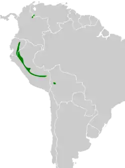 Se distribuye de forma local y fragmentada en los contrafuertes orientales de los Andes desde el oeste de Venezuela, por Colombia, Ecuador, Perú, hasta el norte de Bolivia.[4]