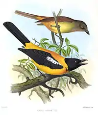 La tangara gorjinegra[3] (Lanio aurantius), también denominada acalandriado cabecinegro, frutero de pico ganchudo, tangara capucha negra, tángara garganta negra, tangara cabecinegra o tángara-lanio gorjinegro,[4] es una especie de ave paseriforme de la familia Thraupidae perteneciente al género Lanio. Es nativa del sureste de México y noreste de América Central.