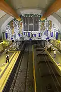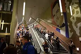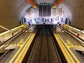 Los andenes, en sus extremos, están decorados con murales en tonalidades naranja, verde y azul. El acceso a los andenes tiene un mural con la imagen de Hugo del Carril realizado por el artista plástico Marino Santa María como parte del paseo cultural del tango. Ocupa una superficie de 500 metros cuadrados y para hacerse se utilizó un millón de venecitas.[8][9][10]