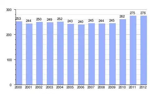 Gráfica de evolución demográfica de Las Pinedas entre 2000 y 2012 |