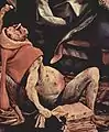 Fijándose bien, todo el drama está en la figura obscena y digna de compasión del pobre enfermo, con una capucha roja, que está en primer plano sobre el lado izquierdo de la tabla. El vientre hinchado, el cuerpo plagado de putrefacción de pústulas y de bubones, se retuerce en un dolor sin esperanza, salvo la que representan los ángeles que se ven a lo lejos en el cielo, en un halo de luz, mientras están sobrevolando la escena y que vienen a aliviarle sus sufrimientos. No tiene importancia debatir, como se ha hecho, si el mal que lo devora es aquel, de efectos terribles, del fuego de san Antonio (que los buenos monjes de Isemheim intentaban curar) o el igualmente inmundo de la sífilis. La figura doliente se convierte en la metáfora de la desesperación en que puede caer el hombre. Quién, si no él, puede pronunciar las palabras escritas sobre el cartel que se encuentra en la parte inferior izquierda del cuadro: Bone Jhesu, ubi eras, quare non affuisti ut sanares vulnera mea?.