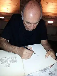 ![]() Altuna firmando un ejemplar del cómic (2014). | ||
