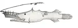 Posee un señuelo bioluminiscente con tres puntas en el extremo, que se ubica en un tallo que sale de su cabeza a modo de caña de pescar. El tallo tiene unas 'bisagras', lo que le permite articular y doblar hacia delante o hacia atrás. Posee una mandíbula superior de alrededor el doble de tamaño respecto a la inferior, y dientes enormes al borde de su boca. Además, como los otros thaumatichthyidae, puede doblar el borde de su premaxilar para formar una especie de jaula.