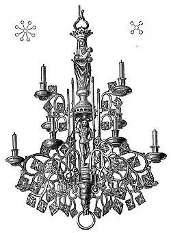 La obra más antigua en latón del distrito de Mosa es la fuente en la iglesia de San Bartolomé en Lieja, una maravillosa vasija apoyada en bueyes, el exterior del cuenco hecho en alto relieve con grupos de figuras participando de ceremonias bautismales; fue realizada entre 1113 y 1118 por Renier de Huy, el fabricante de un hermoso incensario en el museo de Lille. A partir de entonces se realizaron una serie de magníficas obras para iglesias y catedrales en forma de fuentes, atriles, candelabros pascuales y de altar, tabernáculos; las fuentes de contorno simple tienen cubiertas ricas frecuentemente adornadas con temas de figuras; los atriles generalmente están coronados por un águila de forma convencional, pero a veces por un pelícano; un grifo corona el atril de Andenne. Las gradas que sostienen estas aves son a veces de rica tracería gótica, con figuras y restos sobre leones; las formas posteriores muestran un eje de forma cilíndrica, con molduras a intervalos, que se extiende a una base ancha. Varias de estas obras se encuentran en Alemania en el distrito de Colonia, que puede sean de fabricación local; algunas permanecen en las iglesias de Venecia. Existen varias obras en iglesias inglesas, como en Norwich, St Albans, Croydon y otros lugares. En su mayor parte, siguen el mismo modelo, y probablemente fueron importados de Bélgica; existen candelabros de bronce en la Iglesia del Templo, Bristol, en el Monte de San Miguel, Cornualles, y en el Norte de Gales. Los atriles deben haber establecido la moda en Inglaterra para este tipo de objeto; durante varios siglos se los encuentran, como en la Capilla de San Jorge, el Castillo de Windsor, la Capilla del King's College, Cambridge, la Catedral de San Pablo y algunas iglesias de Londres. En la región de Colonia se produjo mucho trabajo de bronce y todavía permanece en las iglesias; se destaca el hermoso trascoro de la Catedral de Xanten, el trabajo, se dice, de un artesano de Maastricht, Países Bajos, a principios del siglo XVI. Un ejemplo moderno es el trascoro de Hereford en la catedral de Hereford, hecha por George Gilbert Scott en 1862 en una variedad de metales donde domina el bronce.