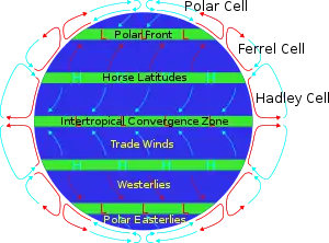 Las latitudes del caballo están asociadas con el anticiclón subtropical y el descenso a gran escala de las corrientes de aire a gran altitud que se mueven hacia los polos. Después de llegar a la superficie de la tierra, este aire se propaga hacia el ecuador, como parte de los vientos alisios predominantes o hacia los polos, como parte de los vientos del oeste.[1]