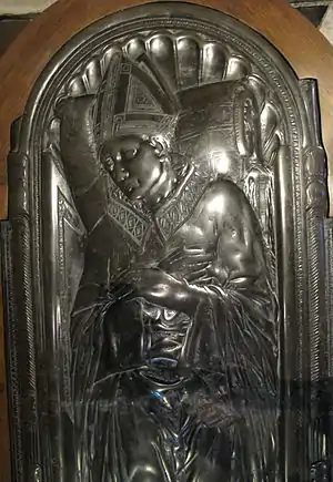 Los pliegues de las vestiduras crean una sensación típica del artista, mientras que la cara del obispo se muestra serena y de líneas suaves, en contraste con el resto. El cojín se apoya sobre un nicho en forma de concha, tan característico en el arte del Renacimiento.