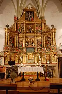 El retablo mayor romanista estaba a cargo de Diego Jiménez en 1611, fecha en que traspasó su obligación a Bartolomé Calvo, maestro escultor vecino de Asarta, el cual todavía lo estaba realizando en el año 1622. La traza en artesa para adaptarse al ábside del templo, consta de banco, dos cuerpos y ático, a los que se añadió en época rococó un segundo banco para disimular sus proporciones. El cuerpo bajo tiene tres calles y dos entrecalles, articulándose la calle central por dos columnas de capitel corintio y fuste muy decorado con follajes que incorporan niños, mientras que los soportes de las calles extremas son dobles; las cajas de estas últimas rematan en frontones rectos y las entrecalles van coronadas con frontones curvos. El cuerpo segundo queda reducido a tres calles en un solo plano frontal, enlazando con el anterior a través de grandes volutas; como soportes se utilizan aquí columnas dobles en los extremos y sencillas en el centro, todas ellas de capitel compuesto y fuste con el tercio inferior decorado más los dos restantes con decoración de estrías entorchadas. Sirve de remate un ático entre machones estriados que culmina en frontón recto partido con cruz en su centro y remates herrerianos en los arranques; el enlace con el cuerpo inmediato se efectúa también a través de dos aletones planos, lo cual da como resultado un perfil triangular.