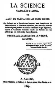 - Lenain, La Science cabalistique, ou l’art de connaître les bons génies qui influent sur la destinée des hommes ; avec l'explication de leurs talismans et caractères mystérieux, et la véritable manière de les composer ; suivant la doctrine des anciens Mages Égyptiens, Arabes et Chaldéens, recueillie d'après les Auteurs les plus célèbres qui ont écrit sur les Hautes Sciences, Paris, Éditions traditionnelles, 1963 (reprints 1972, 1979, 1989)