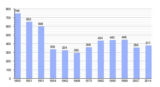 Los datos demográficos contemplados en este gráfico de la comuna de Le Bleymard[4] se han cogido de 1800 a 1999 de la página francesa EHESS/Cassini, y los demás datos de la página del INSEE.[5]