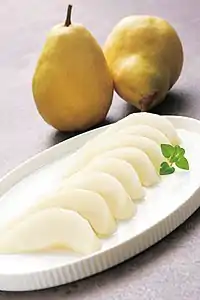 La pera 'Le Lectier' cultivado en todas las regiones de Francia. Debido a la delicadeza de su epidermis, que se ennegrece al menor golpe, impide que esta variedad sea catalogada como fruta comercial.