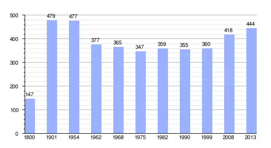 Gráfica de evolución demográfica de Le Thoureil entre 1800 y 2013 |
