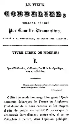 (en español: Periódico escrito por Camille Desmoulins, diputado en la Convención y Decano de los Jacobinos), seguido de la fecha y el texto.
