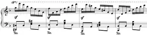 La composición está marcada con vivacissimamente (muy viva, de vivace),[5] 112 blancas por minuto. El primer tema en semicorcheas está acompañado por un ostinato bajo repetitivo en corcheas, que ilustra la fugaz locomotora de vapor.[3] El segundo es una melodía más ligera en el modo mayor submediante, en si bemol mayor, el cual comprende solo semicorcheas, que representan el feliz viaje de los pasajeros.[6] El único respiro del torrente llega en la coda, en la que las duraciones de las notas se alargan y la pieza llega a su fin, representando el tren que llega a una estación.[4] La longitud de la pieza, en la impresión (506 compases), no la ejecución (5 minutos), es humorísticamente referida como la descripción de un viaje muy largo.[7]