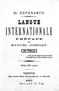 Fue bajo el nombre de Langue Internationale, que apareció en 1887, el primer libro de texto en Esperanto, publicado por su creador Ludwik Zamenhof Lejzer bajo el seudónimo de Dr. Esperanto.