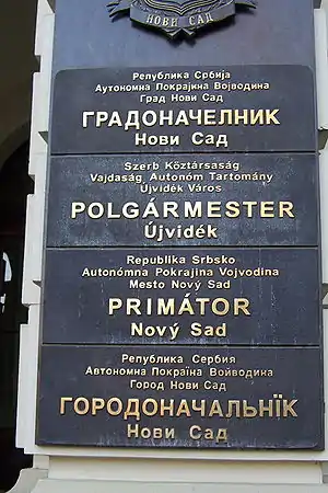 Cartel de la oficina del ayuntamiento de Novi Sad escrito en cuatro lenguas (serbio, húngaro, eslovaco y ruteno).