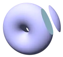 Un toro es el cuerpo espacial que resulta cuando un círculo con radio r gira alrededor de un eje situado en el mismo plano que el círculo, a una distancia R del centro del círculo (figura de la derecha). Si R > r , se produce un toro de anillo . Si R = r , se produce un toro de cuerno , cuando la apertura se contrae en un solo punto. R < r resulta un toro axial , donde sólo quedan dos "dips" de la apertura, estos "dips" son menos profundos a medida que R acerca a 0. Cuando R = 0, el toro degenera en una esfera con radio r .[3]