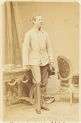 ![]() Fotografiado de pie, mirando ligeramente hacia la derecha, vistiendo un uniforme militar. Sostiene un sombrero en su mano izquierda. | ||