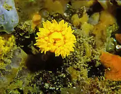 El tejido, o coenosteum, que recubre el esqueleto, o coralito, así como el disco oral y los tentáculos, son de color amarillo intenso. En ocasiones de color blanco amarillento.