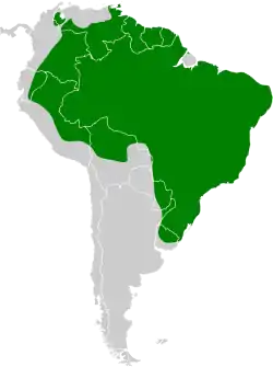 Se encuentra en Sudamérica desde Colombia, Venezuela y las Guayanas hasta el norte de Paraguay, Argentina y Uruguay.