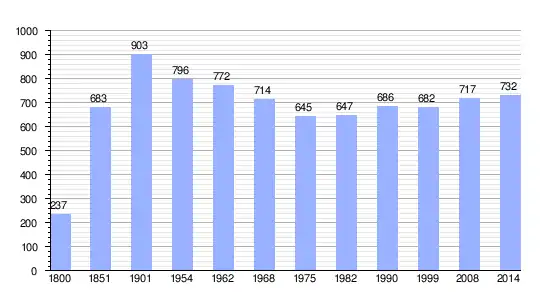 Los datos demográficos contemplados en este gráfico de la comuna de Les Châtelliers-Châteaumur[4] se han cogido de 1800 a 1999 de la página francesa EHESS/Cassini, y los demás datos de la página del INSEE.[5]