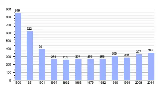 Los datos demográficos contemplados en este gráfico de la comuna de Les Moitiers-en-Bauptois[4] se han cogido de 1800 a 1999 de la página francesa EHESS/Cassini, y los demás datos de la página del INSEE.[5]