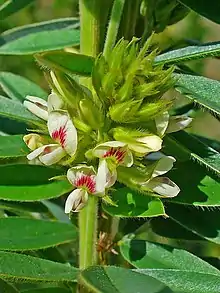 Es un subarbusto perenne con las raíces ramificadas que alcanza los 60-120 cm de altura. El tallo es leñoso en su base. Las hojas, subsésiles, alternas, compuestas con foliolos elípticos. Las inflorescencias es compacta y esférica con flores de color blanco. El fruto es una vaina aplanada.