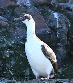 El cormorán geórgico tienen el iris de color azul, las partes superiores negras, las partes inferiores blancas, y las patas de color rosa.[3]