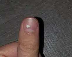 Se caracteriza por pequeñas manchas que se distribuyen por toda la uña. Se produce sobre todo en la infancia como consecuencia de pequeños traumas repetidos.[3] [4][5]