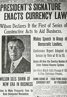 El plan de reforma bancaria y monetaria apoyado por el Presidente Woodrow Wilson en 1913 fue propuesto por los directores de los Comités Monetario y Bancario tanto del Senado como de la Cámara de Representantes, el Representante Carter Glass, un demócrata de Virginia y el Senador Robert Latham Owen, un demócrata de Oklahoma. Según el reporte del Comité de la Cámara de Representantes que acompañó a la Ley Monetaria (H.R. 7837) o la Ley Glass-Owen, como se llamaba comúnmente en ese entonces, la legislación fue preparada tomando ideas de varias propuestas, incluyendo la Ley Aldrich.[6] Sin embargo, a diferencia del plan Aldrich, el cual le entrega el control a los banqueros privados con tan solo una pequeña presencia pública, el nuevo plan le dio un importante rol a una entidad pública, la Junta de la Reserva Federal, al mismo tiempo que establecía un nivel sustancial de autonomía para los Bancos de Reserva regionales, que en ese entonces se les permitía fijar su propia tasa de descuento. Además, en lugar de que la moneda propuesta sea una obligación de los bancos privados, la nueva moneda de la Reserva Federal era una obligación del Tesoro de los Estados Unidos. También, a diferencia del plan Aldrich, la membresía por parte de los bancos certificados era obligatoria, no opcional. Los cambios fueron lo suficientemente significativos que la anterior oposición al sistema de reserva propuesto por parte de los demócratas progresivos fue calmada en gran medida, y en cambio, la oposición a la ley vino de parte de los republicanos ahora, que favorecían más a los negocios en lugar de los demócratas.[1]