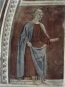 • I episodio: La muerte de Adán (390 x 747 cm). Adán moribundo; Set, su tercer hijo, encuentra al arcángel Miguel a las puertas del Paraíso que le da un grano (o una ramita) del Árbol de la Vida, proveniente del jardín del Edén, para que la plante en la boca de Adán después de su muerte y de esta manera redimir el pecado original. La imagen de Adán y Eva ancianos muestra un hábil tratamiento de la anatomía. Es uno de los primeros desnudos renacentistas.