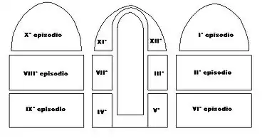 • VI episodio: Victoria de Constantino sobre Majencio en Puente Milvio . Con la cruz en su escudo, derrota al enemigo y más tarde se convierte al Cristianismo.