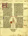 La miniatura representa al padre de Wifredo el Velloso con su escudo de armas, de oro cuatro palos de gules, retiene homenaje al rey de Francia por haber recibido de él el condado de Barcelona. - Genealogia regum Navarrae et Aragoniae et comitum Barchinonae (1376)
