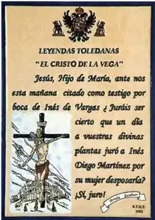 Desesperada pidió al gobernador de Toledo, don Pedro Ruiz de Alarcón, que intercediera. Al solicitar testigos, Inés se atrevió a presentar uno: el Cristo de la Vega.[2] El tribunal en pleno y muchos curiosos acudieron a la iglesia del Cristo de la Vega (Allá por el Miradero, por el Cambrón y Bisagra, confuso tropel de gente del Tajo a la vega baja.[3]) y se arrodillaron ante el cristo. Tras preguntarle si había sido testigo del juramento, se oyó un "sí, juro" y los testigos pudieron ver que el Cristo tenía los labios entreabiertos como si hubiera hablado y la mano desclavada y estirada como para posarla en los autos.