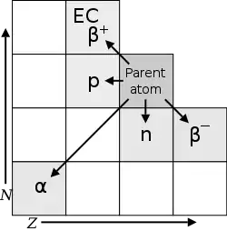 Los desplazamientos resultantes de diversos modos de desintegración de un radionucleido (eje horizontal: Z, número atómico; eje vertical: N, número neutrónico)