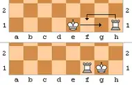 - Las únicas piezas que pueden saltar son los caballos,[11] o también las torres en el caso excepcional del enroque en que salta por encima del rey.[12] Por saltar se entiende que una pieza pase en su movimiento por encima de otra pieza, ya sea adversaria o del mismo bando.
