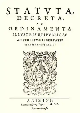 El nuevo ordenamiento jurídico era una actualización del “Statuti Comunali” (Estatuto Comunitario) que había servido a San Marino como norma básica desde aproximadamente el año 1300. Las instituciones existentes, como el Consejo de los Sesenta, se adelantaron de este período. Los Estatutos forman la base de todas las leyes vigentes en la actualidad, por lo que puede ser la constitución más antigua vigente de cualquier nación.[3]