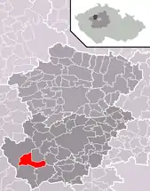 Se encuentra ubicada al noroeste de la región y de Praga, a poca distancia al norte del río Berounka —un afluente izquierdo del río Moldava—, y cerca de la frontera con la región de Ústí nad Labem.[1]
