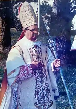 ![]() Don Licinio el día de su consagración con el báculo de Monseñor Lefebvre. | ||