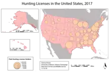 Las licencias para cazar típicamente salen a la venta una vez al año.[10] Algunos estados, como Nueva York, permiten sólo durante una estación sola definida, o de manera indefinida para las temporadas anuales de caza, para residentes del estado, a pago de los derechos apropiados.[11][12] Como regla general, las licencias son no-transferable, es un privilegio, y no permiten cazar sin autorización en áreas privadas.[13]