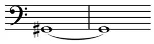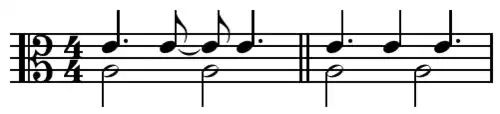- Como signo de prolongación con forma de una línea curva que conecta las cabezas de dos notas consecutivas de la misma altura, aunque no necesariamente del mismo valor. Indica que se van a reproducir como una sola nota con una duración igual a la suma de los valores de las notas individuales. Por ejemplo una negra ligada a una blanca tiene el valor total de una blanca con puntillo.[1]
