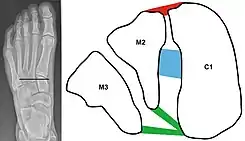 C1 = cuneiforme medial M2 = base del segundo metatarsiano M3 = base del tercer metatarsiano Rojo = ligamento de Lisfranc dorsal Azul = ligamento de Lisfranc interóseo Verde = ligamento de Lisfranc plantar. | ||