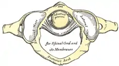 ![]() Articulación entre la apófisis odontoides y el atlas. (Ligamento transversal visible en el centro). | ||