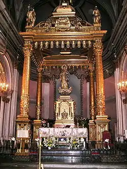 Exteriormente se presenta como un volumen compacto, aunque en el interior se halla dividida en tres naves, de mayor altura la central, pero que han sido igualadas gracias a la construcción de una cámara sobre las laterales. Asimismo cuenta con un crucero cubierto con cúpula. La cabecera es semicircular en el interior, aunque recta en el exterior, y se halla integrada por el espacio central de la Capilla Mayor, en la que se sitúa un gran baldaquino cobijando la imagen de la Inmaculada, y dos capillas laterales (la de la derecha, con uso de sacristía).