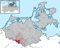 Se encuentra al sur del distrito, junto a la frontera con el distrito de Rostock.
