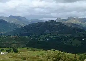 - Mirando NE de la cumbre de Lingmoor (estiva) hacia la Capilla Stile y hacia la cantera de Burlington en Grand Langdale.