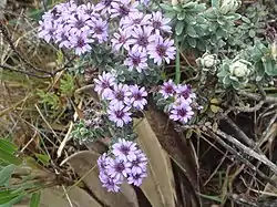 Alcanza 2 m de altura. Ramas terminales densamente foliosas y lanudas. Hojas gruesas, rígidas, coriáceas, de 6 a 14 mm de longitud por 3 a 6 mm de ancho, con la margen revoluta, contraída, haz glabra, verde azulosa a amarillento-verdosa; envés lanudo, ocroleuco. Inflorescencias terminales racemoso-umbeladas. Flores femeninas 11 a 25, con corola color violeta, azul o lila, de 7 a 9 mm. Flores hermafroditas 5 a 13, corolas de 5 a 7mm, lóbulos oblongos, subagudos y violáceos.[1]
