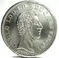 - Cabeza de Carlos Luis de Borbón Parma, con la leyenda: CARLO LOD[OVICO]. I[NFANTE].D[I].S[PAGNA].DUCA DI LUCCA· Carlos Luis Infante de España Duque de Lucca.Abajo, en el centro, LANDI, Carlo Landi, ensayador