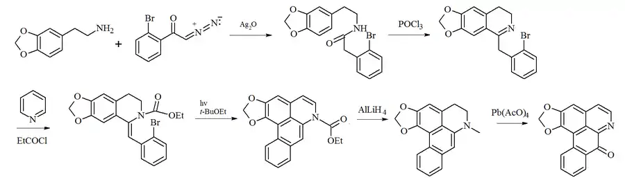 La irradiación de etil (Z)-l-(2-bromobenziliden)-6,7-metilenedioxi-1,2,3,4-tetrahidroisoquinolina- 2-carboxilato de etilo produjo 6,7-dihidro-5H-benzo[g]-1,3-benzodioxolo[6,5,4-de]quinolina-7-carboxilato de etilo, seguido de la reducción con hidruro de litio y aluminio para dar el derivado 7-metilo. La oxidación posterior de este precursor da liriodenina con rendimiento moderado[8]