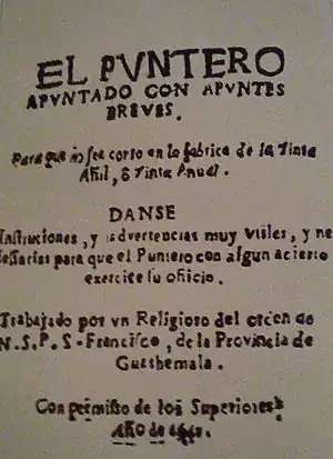 Una obra alejada de la temática religiosa, fue el manual para la manufactura del añil, El puntero apuntado con apuntes breves, de Juan de Dios del Cid, quién fabricó por cuenta propia una rudimentaria imprenta para publicar su obra, que cabe decir fue la primera impresa en territorio salvadoreño.[2] El documento tiene por fecha de impresión 1641, pero Luis Gallegos Valdés, crítico literario salvadoreño, sostiene que esta fecha se debe a un error tipográfico, pues algunas referencias históricas lo sitúan en el siglo siguiente. Además, puede hablarse de la Carta de Relación, escrita por el conquistador extremeño Pedro de Alvarado con fines eminentemente prácticos; en ella, haciendo gala de sus escasas letras, narra episodios importantes de la conquista de estas tierras.